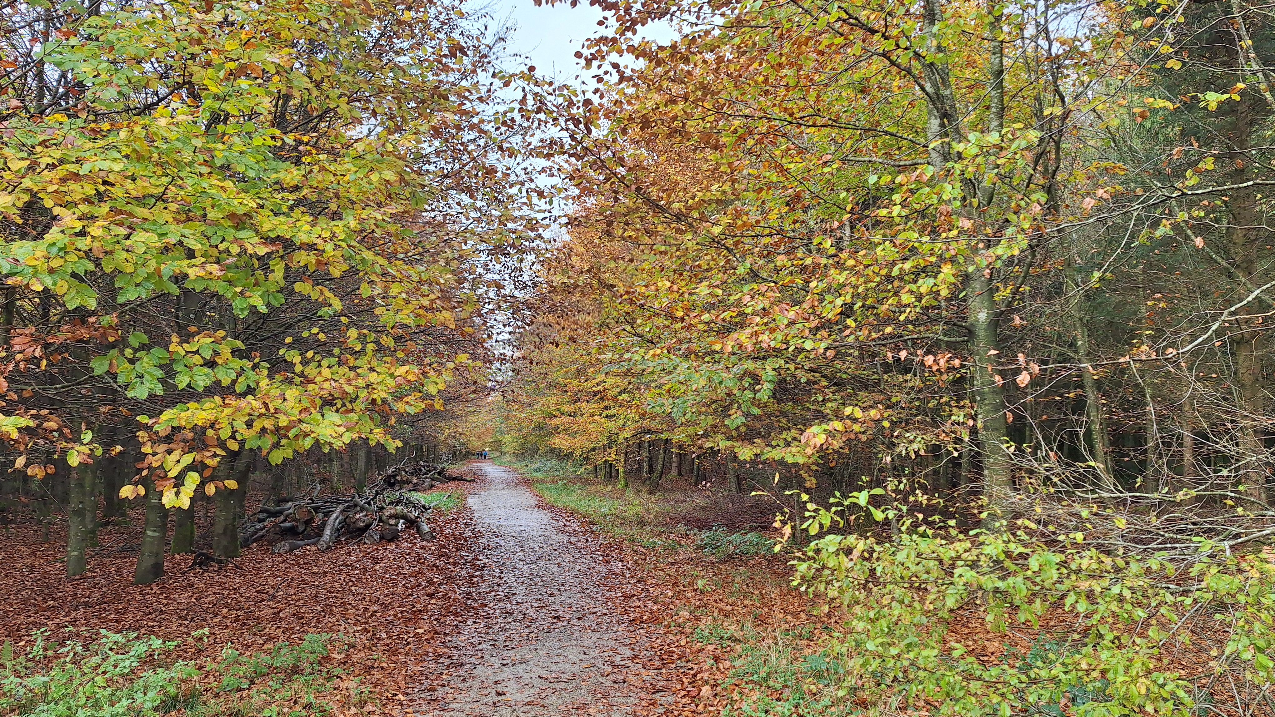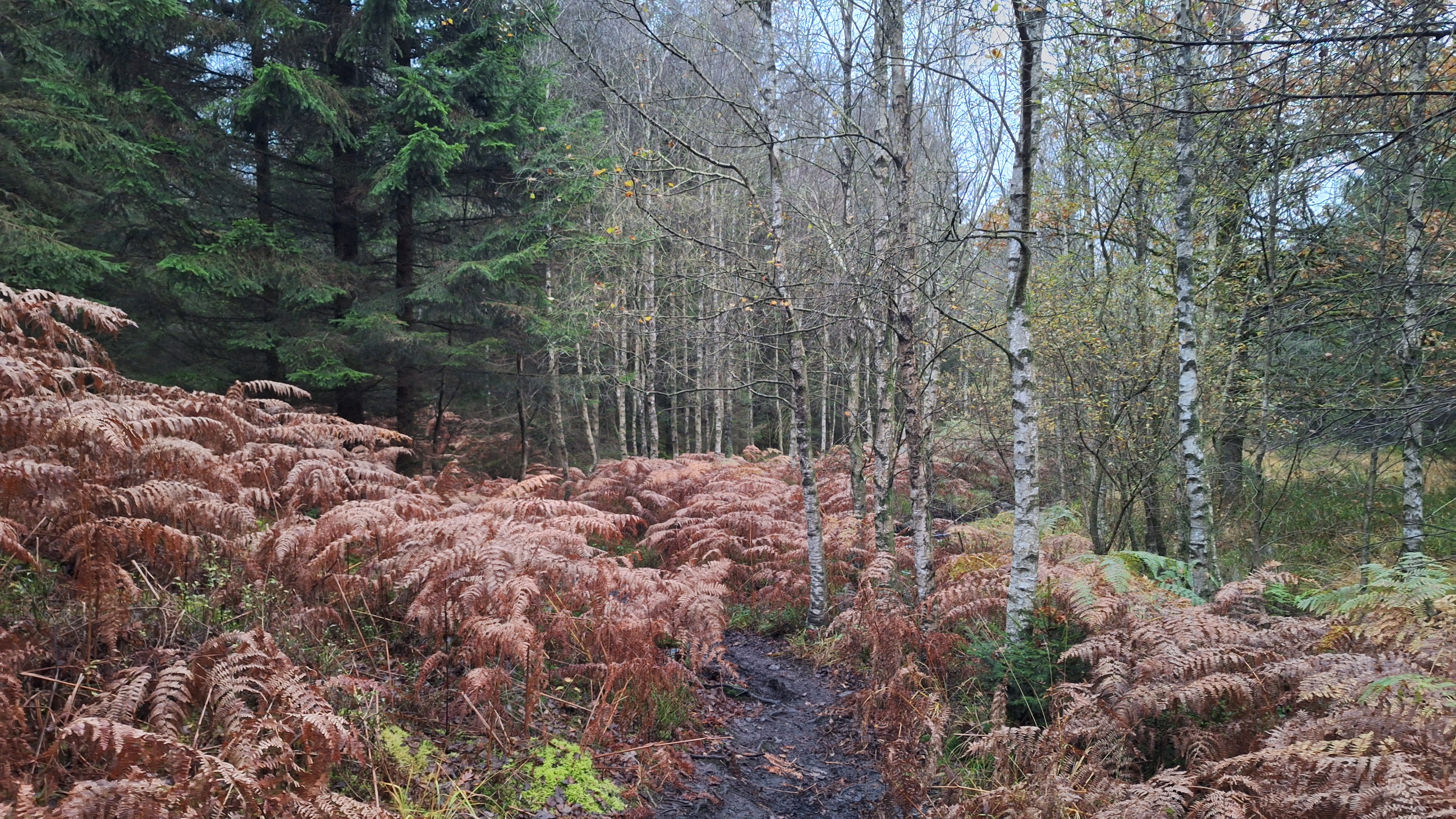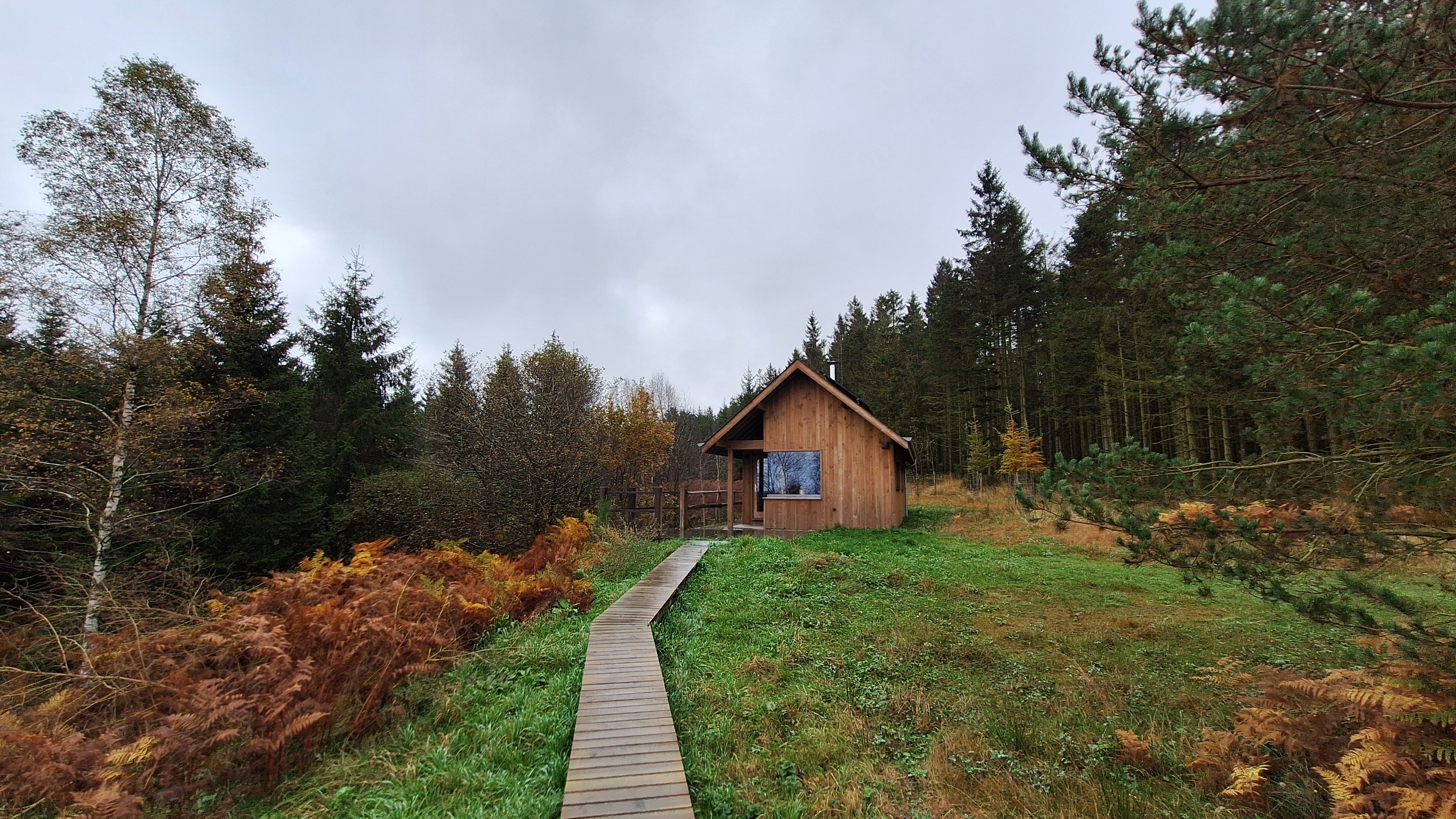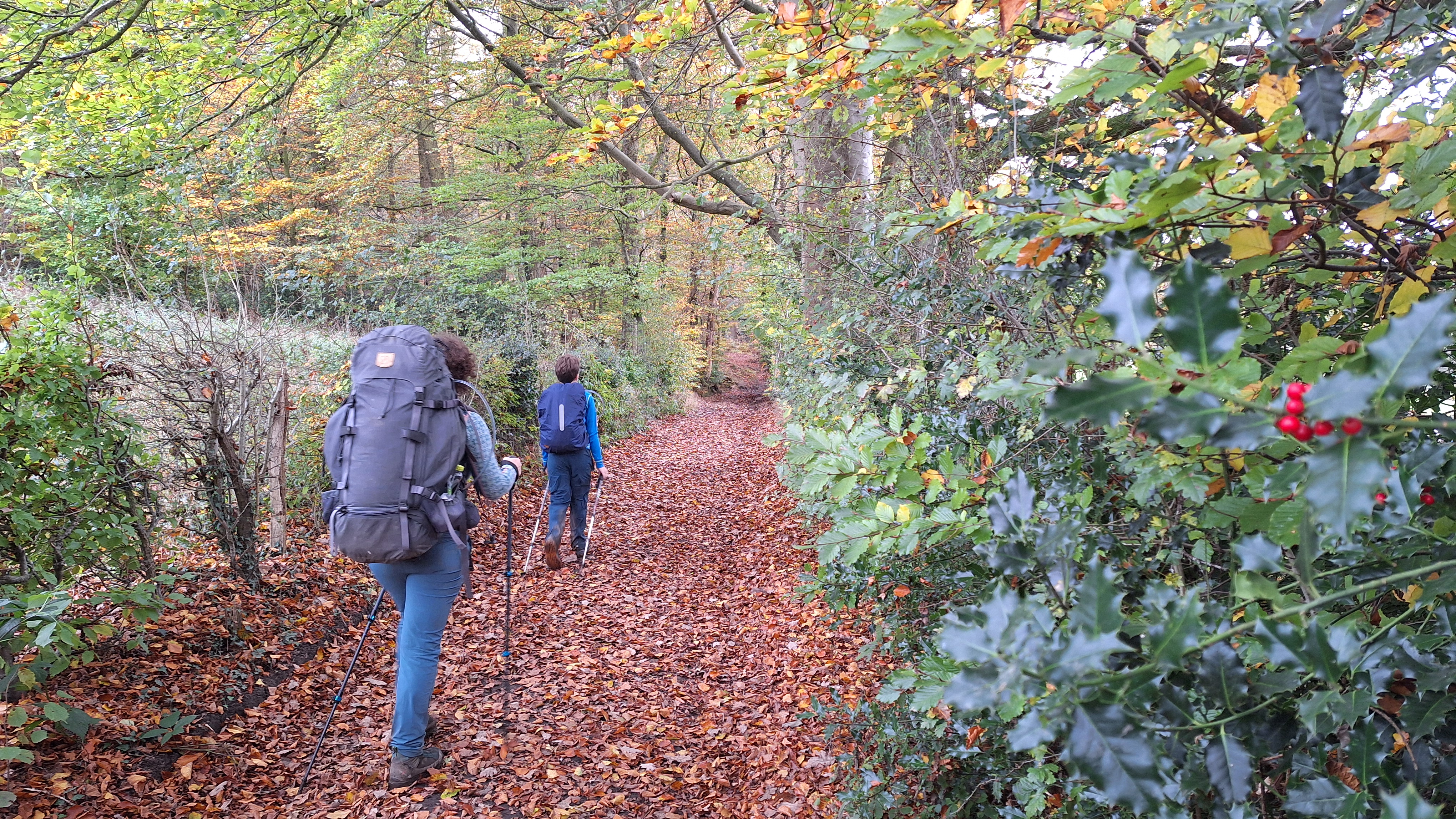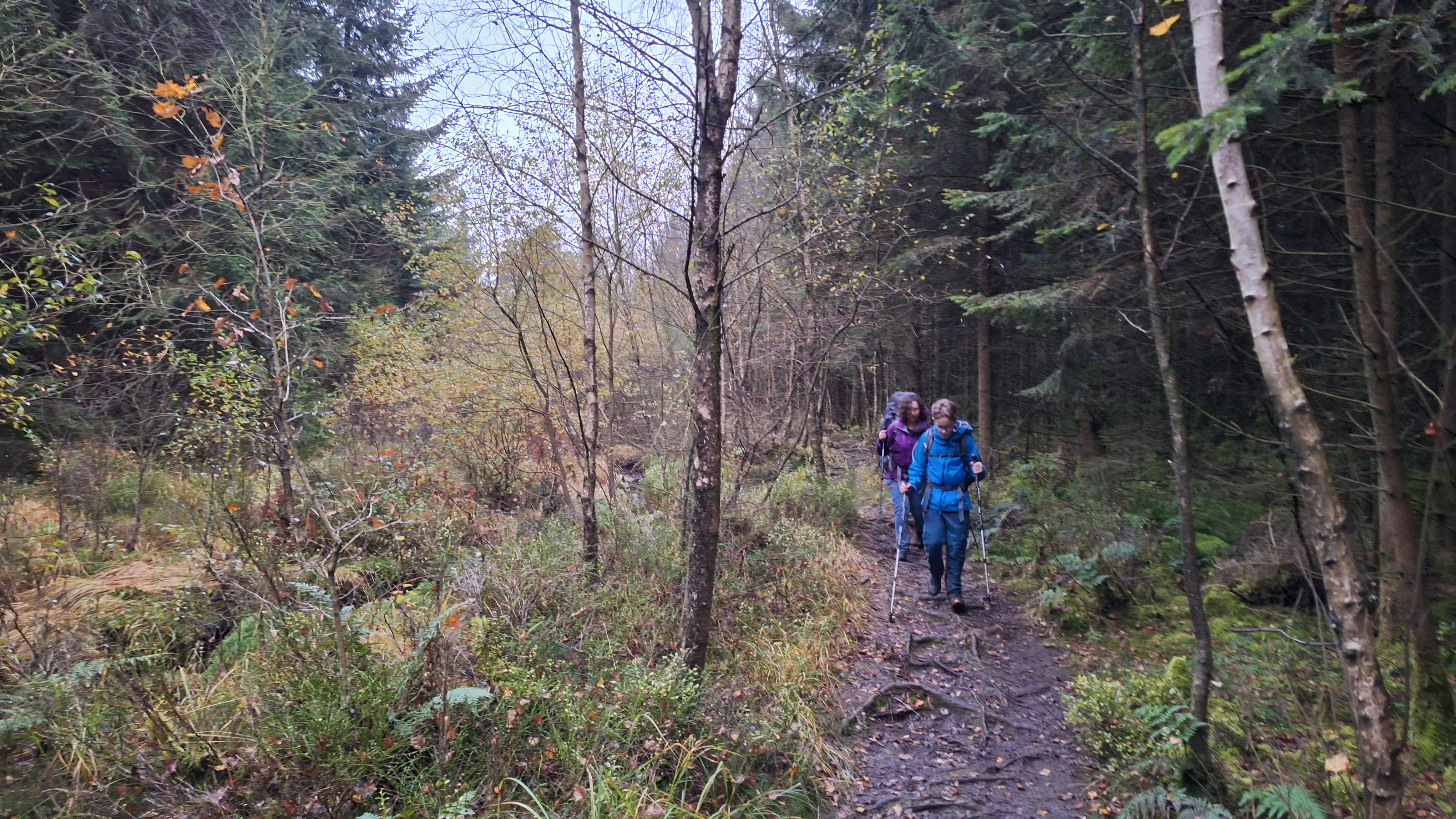 Nabij Wihonfagne slaan we af in westelijke richting om dan meteen terug in noordoostelijke richting een breed pad op te pikken. Het zijn modderige paadjes maar hey, dat zijn de venen hé. Er staat langs een breed pad een hutje met afdak en een fijne geïmproviseerde bank die wij benutten voor onze vroege lunch. Als we aan het opruimen zijn komt er een vader met zoon bij zitten om te picknicken. Gezelligheid is troef maar wij gaan toch maar rustig verder. Het brede pad gaat via een smalle doorsteek terug op in La Vécquée. We zoeken een afslag in zuidoostelijke richting maar dat blijkt privéterrein. We gaan dus nog eventjes verder om dan af te slaan via Les Mousseux aan de Ruisseau de Herbôfaye waar er een prachtig hutje staat, waarschijnlijk privé-eigendom. Nu volgen we de beek in zuidwestelijke richting tot ze overgaat in de Hoëgne. We misten een afslag waardoor we een kleine 500m te ver uitkomen. De rivier oversteken zou misschien wel lukken maar de kans op natte voeten of erger is groot. We besluiten toch maar even terug te keren en zien dan een smal pad naar de beek gaan. Met lichte hoop op een brugje komen we er snel achter dat het springen zal worden. We kijken wat hogerop de beek en zien dat we daar over enkele stenen kunnen stappen om de oversteek te wagen. Dat verloopt veel vlotter dan gedacht. We trekken nu verder over een smal langs de beek slingerend paadje. Zeer mooi met her en der een stroomversnelling en vallende goudgele of oranje bladeren van de bomen.