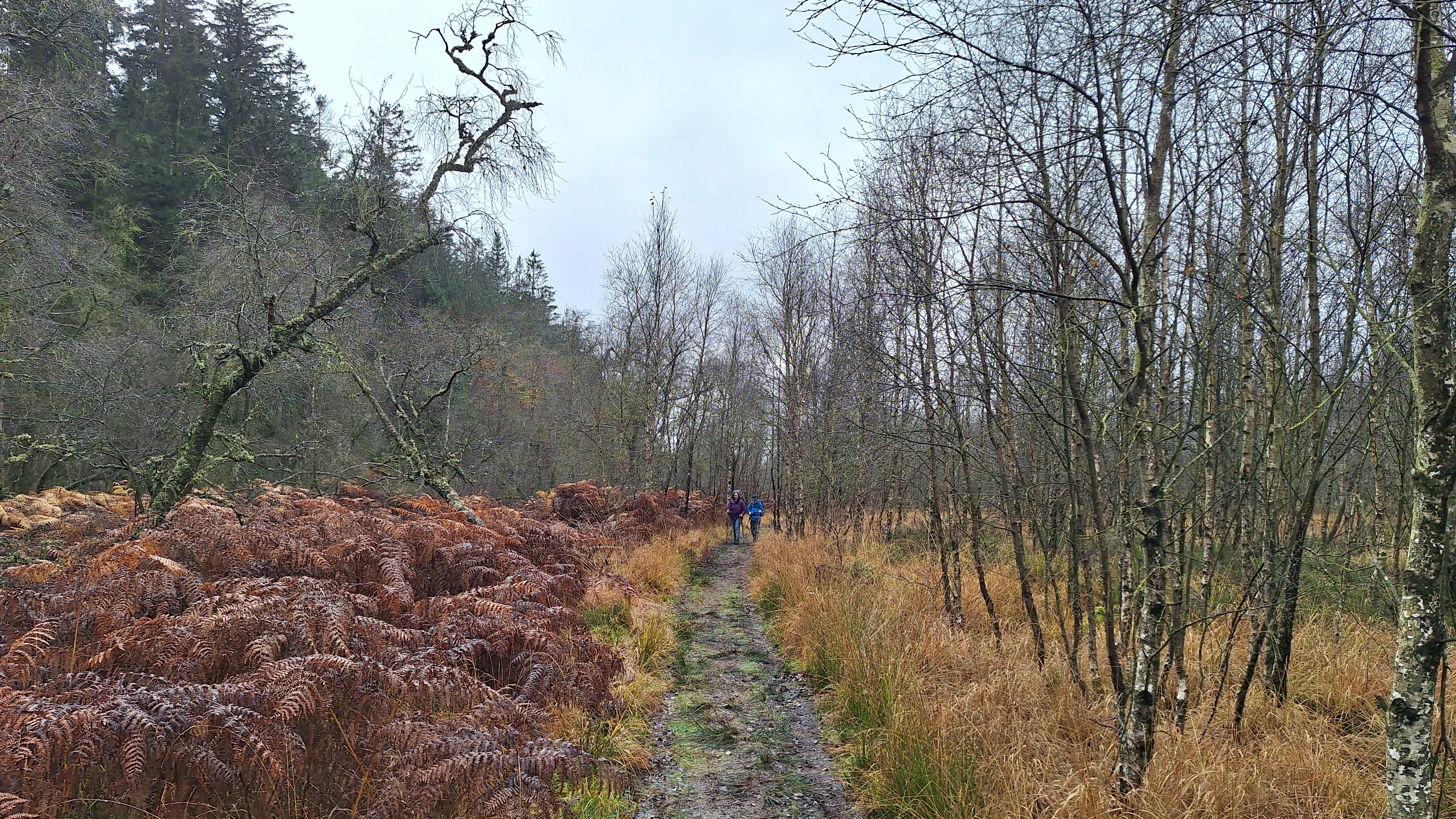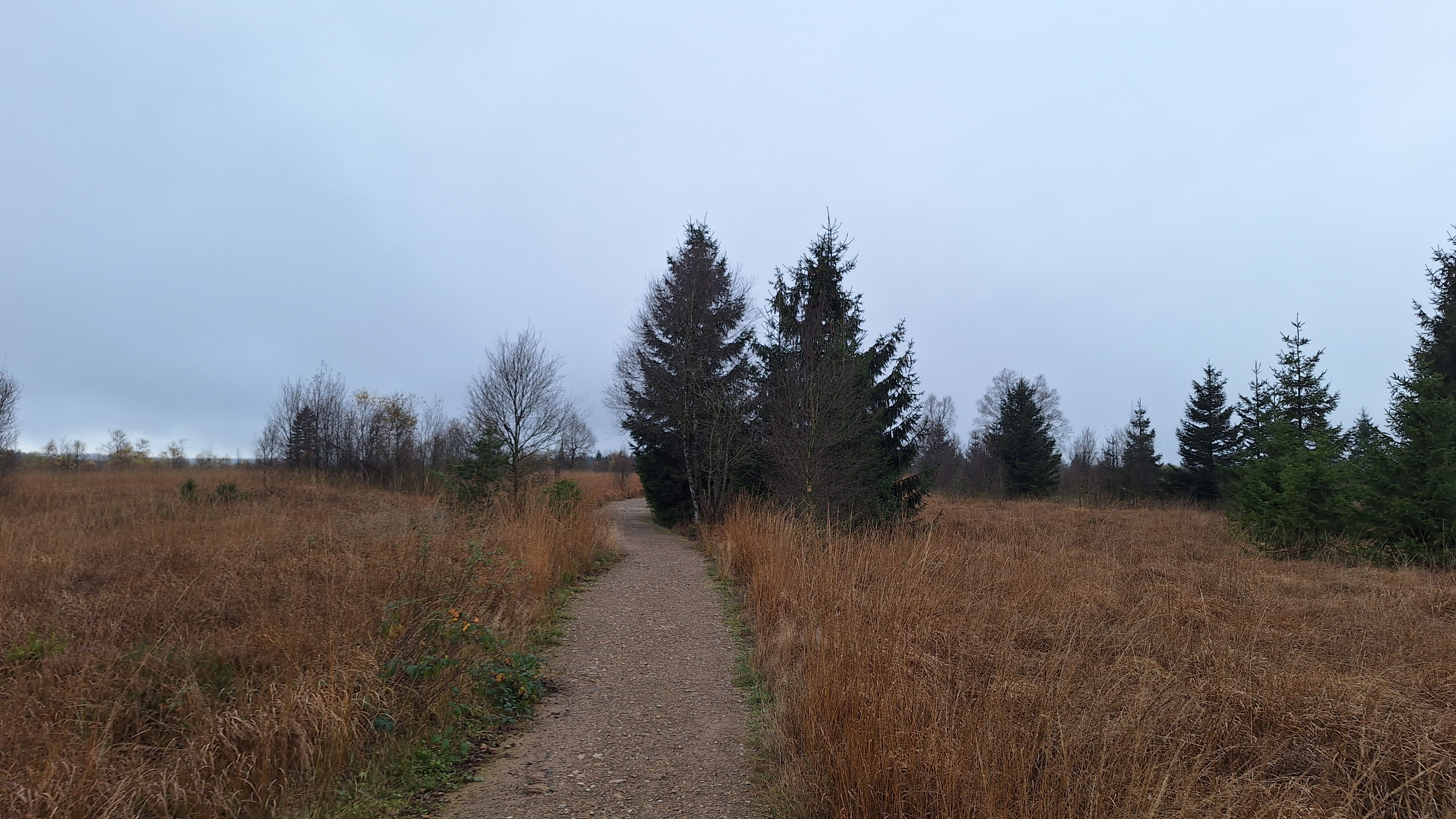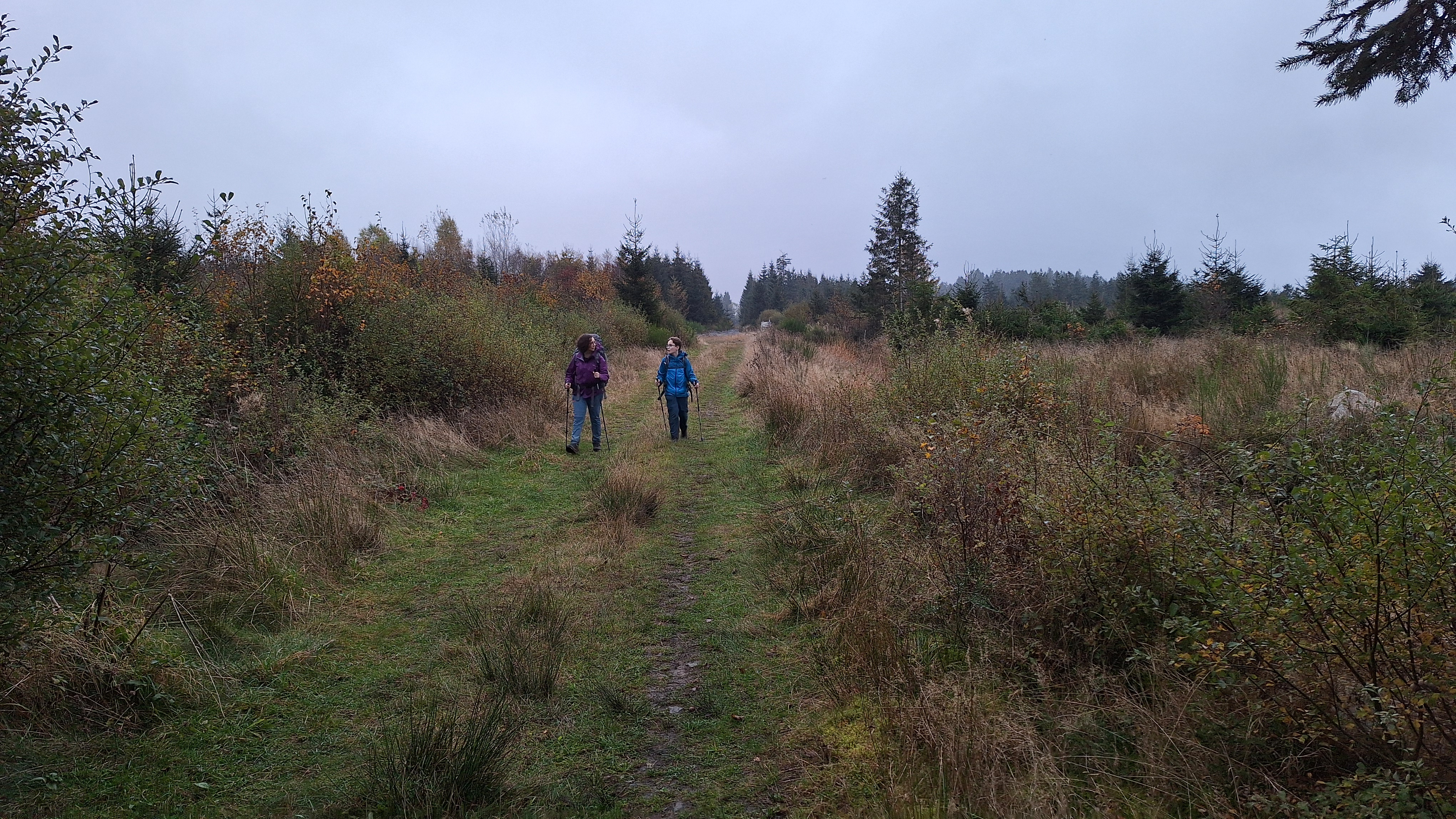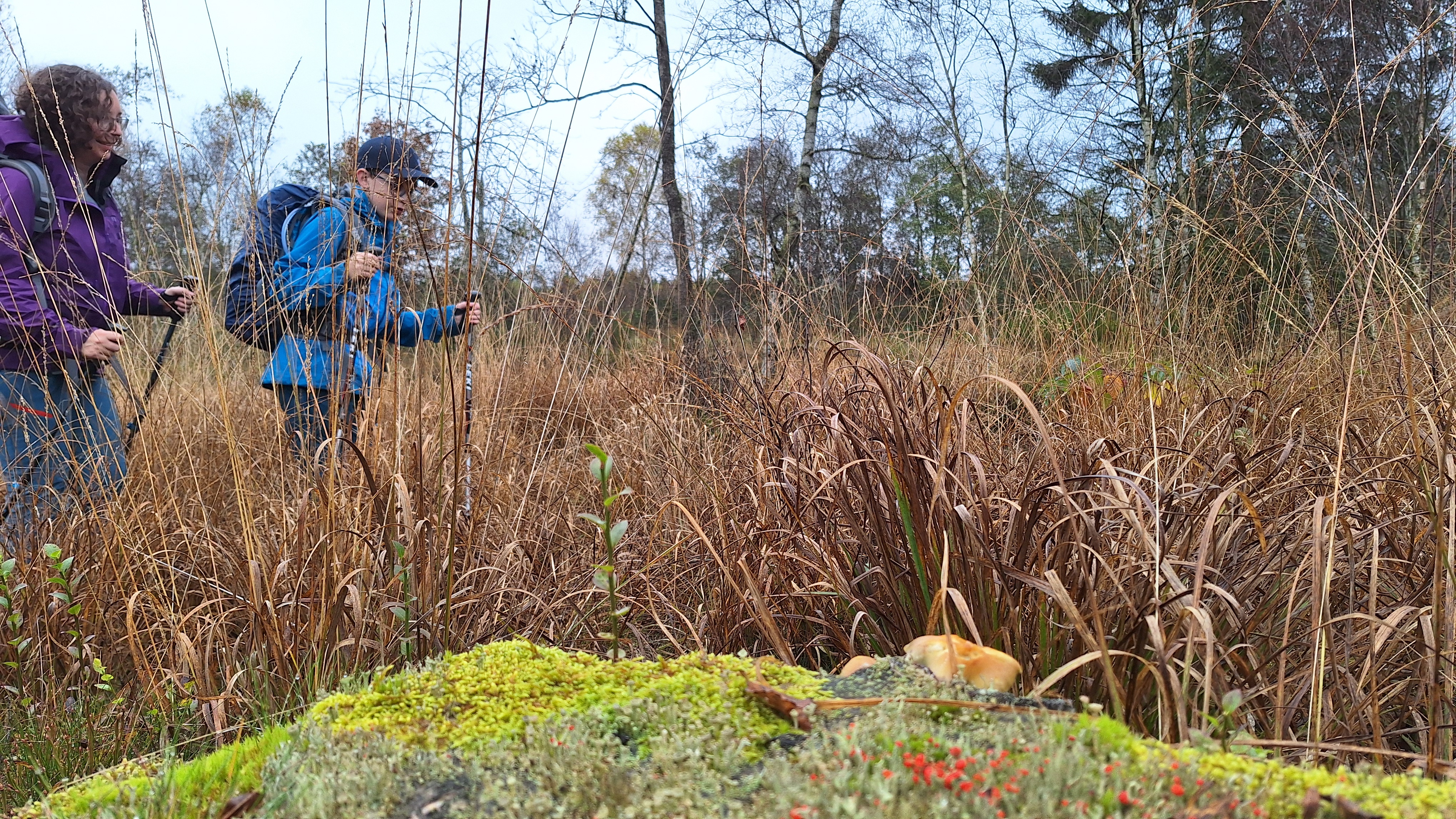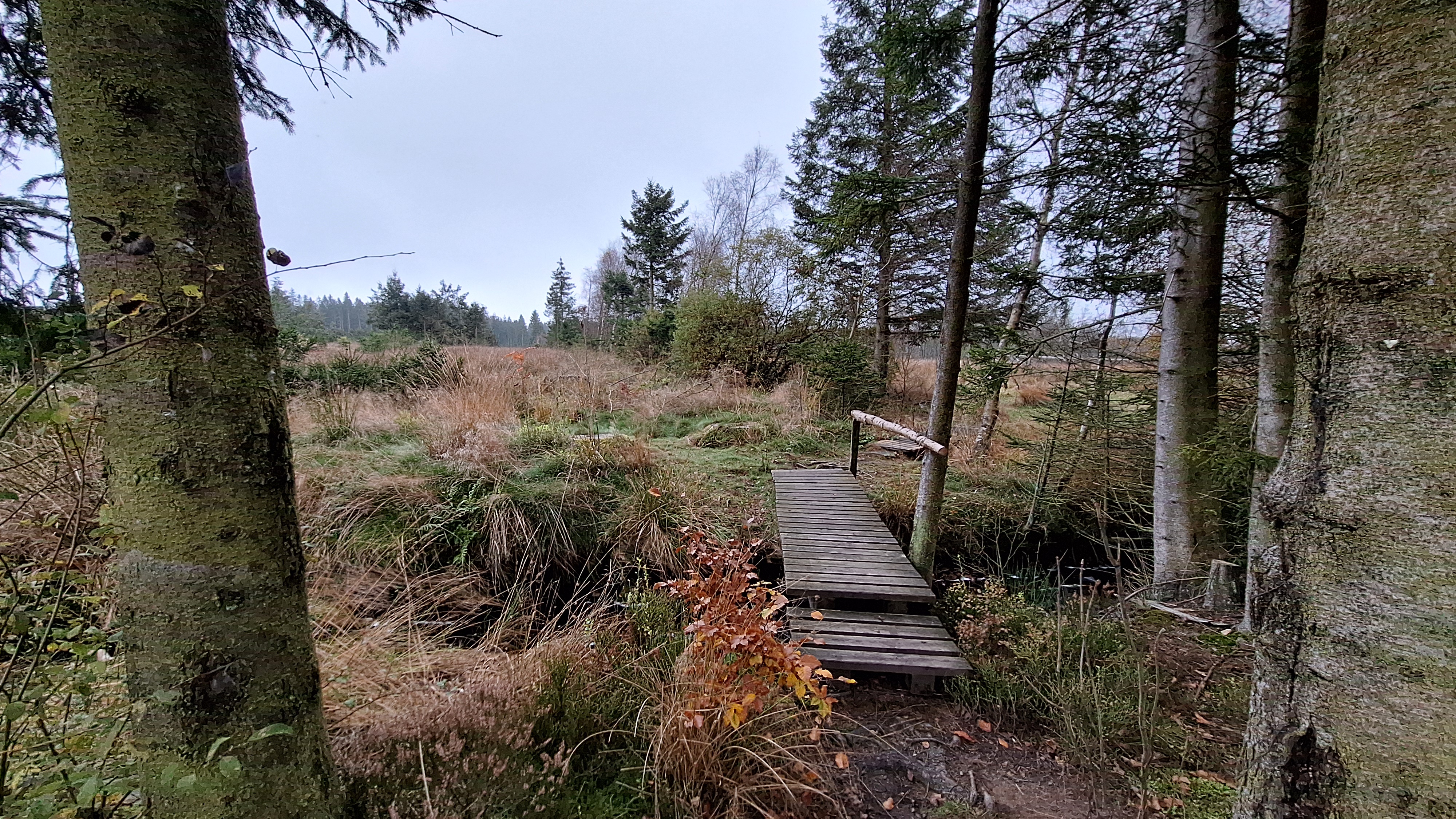 We kunnen met een brugje de Poleur oversteken en wandelen tot aan een hutje voor nog een korte pauze. We eten er een tussendoortje. Louis is het eventjes wat beu omdat het miezert en de rugzak op zijn schouders toch wel begint te storen. Het is dan ook alweer eventjes geleden dat hij een rugzak op had tijdens het wandelen. Trainen jongen, trainen… dat komt wel weer goed en met die te vrolijke noot gaan we verder. We duiken nu de Venen in via Fagne de la Poleur waar het ene vlonderpaadje na het andere volgt. We naderen nu de Baraque Michel en dat is eraan te merken: veel meer volk. Als we er iets willen drinken worden er ook meteen een dame blanche en coupe bresilienne mee besteld. Het smaakt blijkbaar en na een welverdiende pauze gaan we op pad voor een laatste uurtje wandelen.