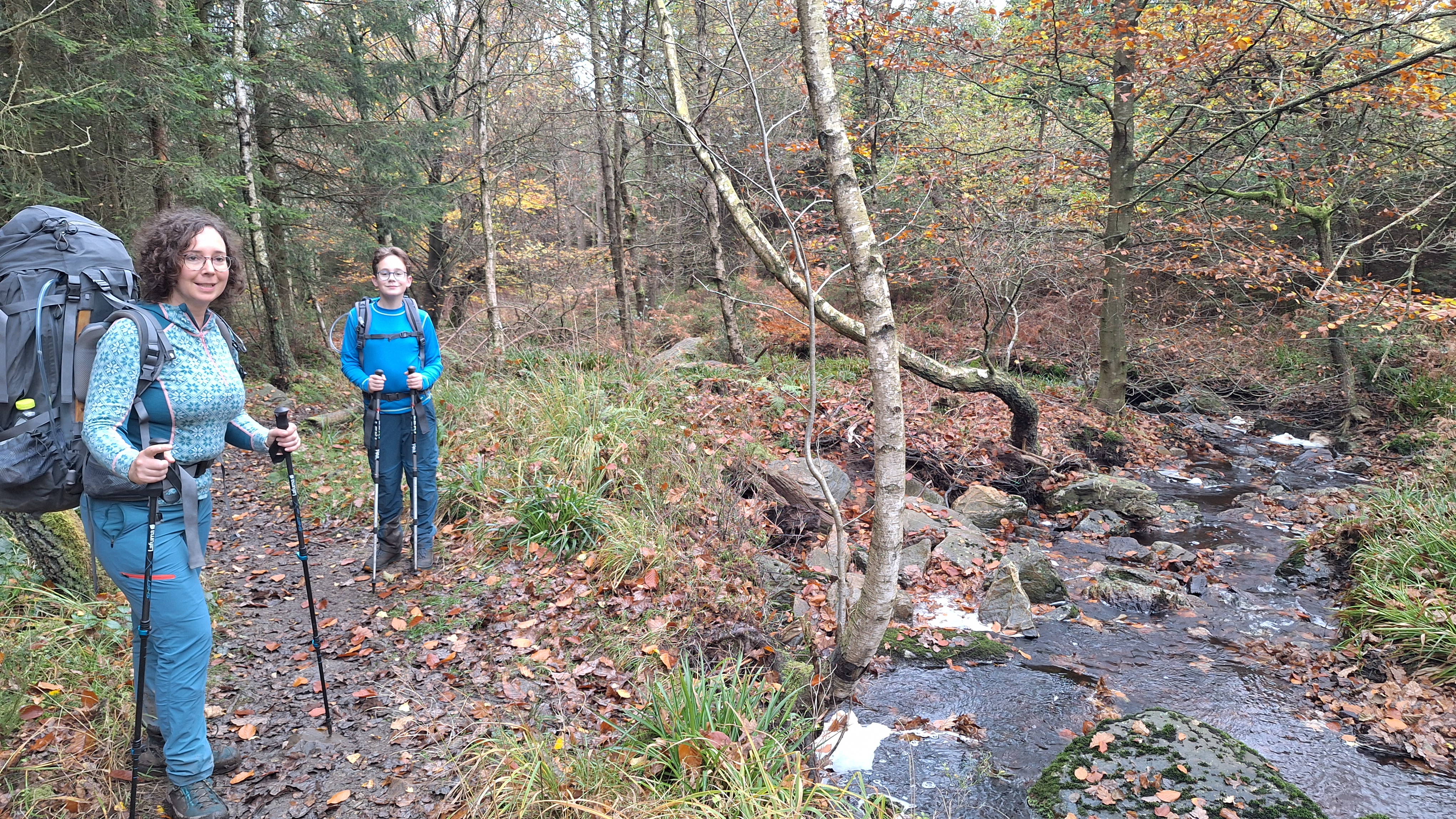 De nacht verloopt rustig, of voor mij toch. Cynthia en Louis wisselen ’s nachts nog even van slaapzak: de ene had het te warm, de andere te koud… Om 8u kruipen we uit de slaapzakken, ruimen op en ontbijten wat. We gaan opnieuw op pad en Louis is goedgehumeurd. Ah ja, hij heeft een half uurtje kunnen gamen. Ideaal om de dag te starten volgens een 11-jarige. Het paadje is prachtig: wisselend van open plekken tot naaldwoud over herfsttaferelen in loofwoud… en zo gaat de hele voormiddag eigenlijk verder. We komen nu op een meer bewandeld pad langs de Statte en passeren de Grand Pierrier de la Statte, de bekende Cascade des Nuttons om dan over te steken aan de Rochers de Bilisse.