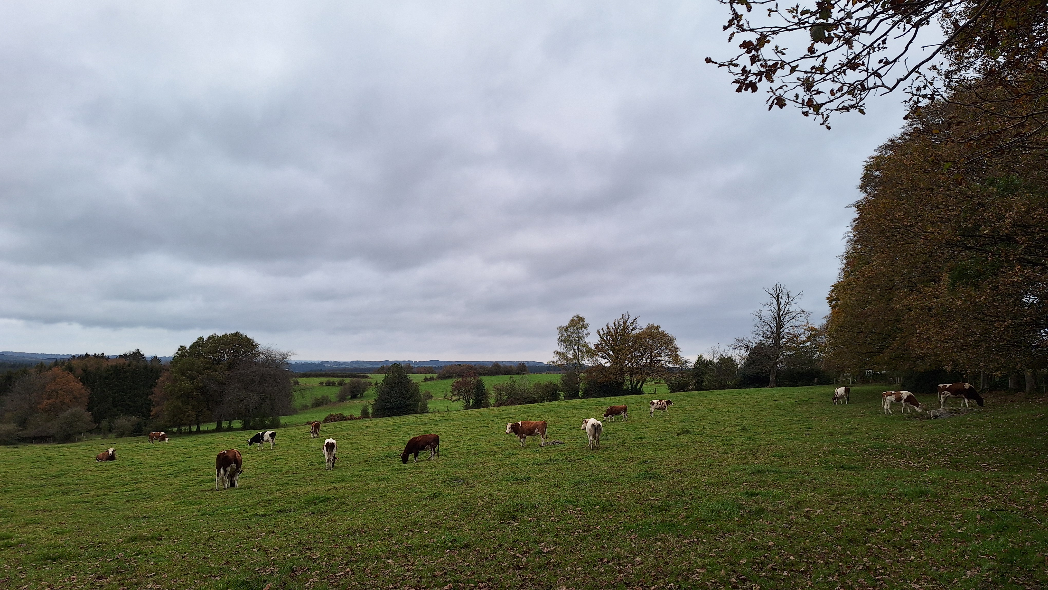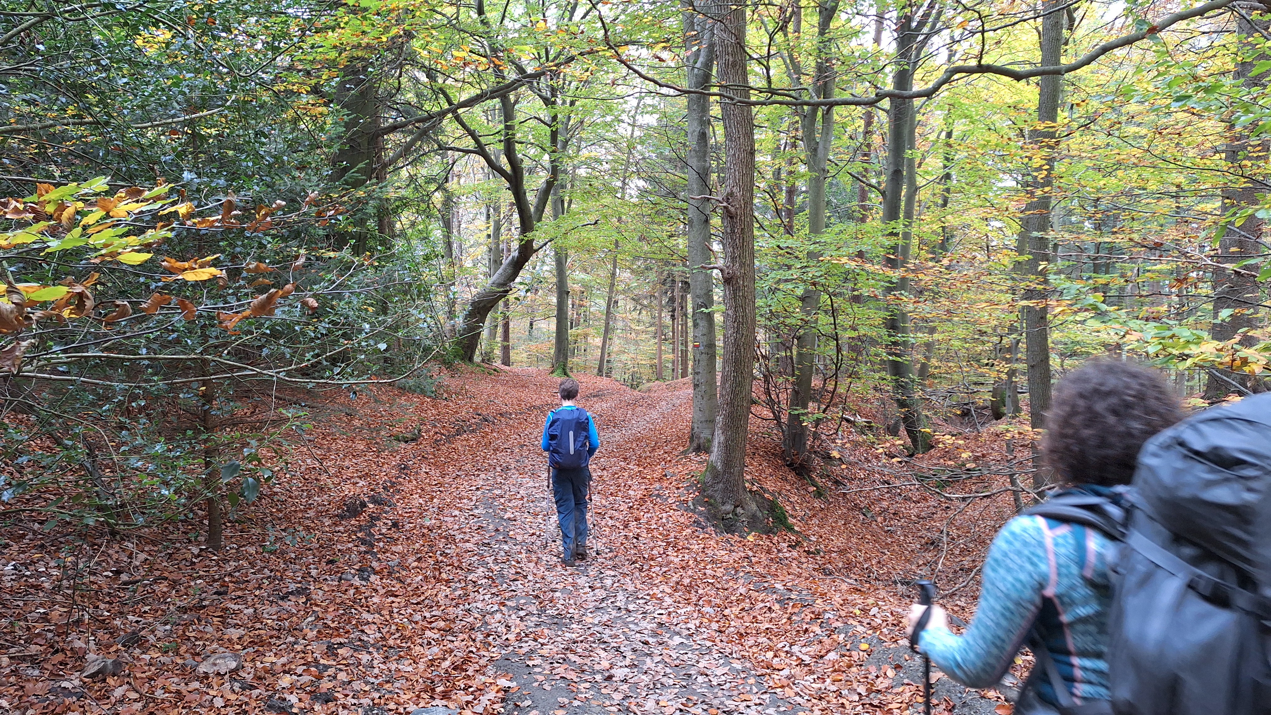 In de herfst trekken we er altijd graag op uit bij het kleuren van de bladeren. Zo ook dit jaar. We trokken met de wagen op iets meer dan een uurtje naar Hockai waar we onze wagen parkeerden nabij de Pont du Centenaire. Hier pikten we, dat zijn Cynthia, Louis (11j) en ikzelf, een zelf ineen gestoken route op. We stijgen meteen rustig omhoog via La Vécquée naar een hogergelegen bos. De mengeling van loof- en naaldwoud geeft heel wat kleur aan de omgeving. Regelmatig passeren we oude grenspalen die zo her en der in de omgeving lijken te staan.